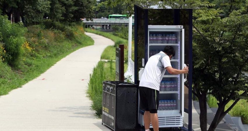 Në Seul, Kore e Jugut, janë vendosur frigoriferë në parqe ku njerëzit mund të marrin ujë për shkak të temperaturave të larta. Në foto është një qytetar duke marrë një shishe uji.