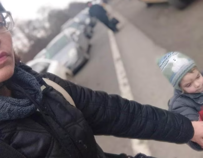 Nelli Syupyur dhe djali i saj rrugës për t’u larguar nga Ukraina në shkurt të vitit 2022.