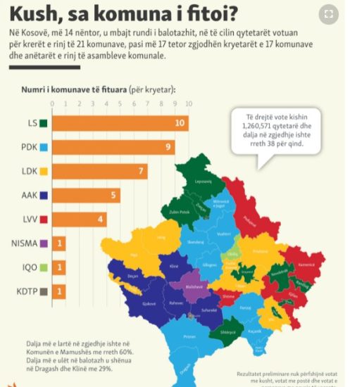Lidhja Demokratike e Kosovës ka fituar në komunat: Prishtinë, Fushë Kosovë, Viti, Junik, Istog, Pejë dhe Lipjan.