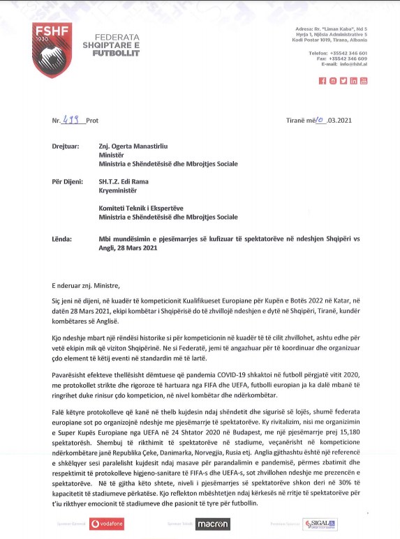 Pas kërkesës së tifogrupit Tifozët KuqeZi për të mbështetur Kombëtaren në stadium gjatë ndeshjeve kualifikuese të Botërorit, ka lëvizur edhe Federata Shqiptare e Futbollit. Sekretari i këtij institucioni, Ilir Shulku, i ka dërguar një shkresë zyrtare Ministres së Shëndetësisë, Ogerta Manastirliu, Kryeministrit Edi Rama dhe komitetit të ekspertëve, për të lejuar tifozët në stadium për ndeshjen me Anglinë, në masën 30%.