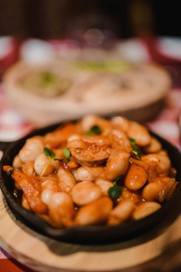 Pasi i kemi bërë të gjitha gati, në një tavë shtojmë fasulet, gjellën që kemi përgatitur, pak verë të bardhë, birrë, uthull. Këto janë për të zbutur fasulet dhe për të lënë shije më të fortë dhe nga lart do shtojmë dhe llukanikun duke e shtypur që mos të mbesë në lartësi pasi mund të digjet.