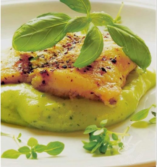 Qërojmë patatet, i presim në kubika dhe i vendosim të zien në ujë me kripë për 10 minuta. Ndërkohë që ziejmë patatet, marinojmë fileton e levrekut me kripë dhe piper të zi, vendosim vajin e ullirit në një enë, shtojmë shafranin dhe i përziejmë bashkë. E lyejmë fileton e levrekut nga ana e mishit me vajin e ullirit dhe shafranin, e vendosim në një tavë me letër furre fileton e levrekut, ku më pas e kalojmë në furrë në temperaturë 200 gradë për 5 minuta dhe ndërkohë pasi është zier patatja, e kalojmë në një enë duke i shtuar gjethet e borzilokut, hudhrën e shtypur, pak vaj ulliri, kripë dhe piper të zi, e bëjmë pure me mikser. Pasi kemi gati puren e patates, e servirim në pjatë së bashku me fileton e levrekut pasi është pjekur.