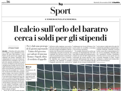 Pas marrëveshjeve të gjetura gjatë bllokimit për të ngrirë disa muaj, ka klube që kanë shpërndarë tashmë pagat për korrikun dhe gushtin. Disa klube kanë bërë akorde me lojtarët që të shtynin pagesën e detyrimeve të sezonit të kaluar, për periudhën e ndalesës së aktiviteteve. La Repubblica ka bërë të ditur se tre prej tyre, nuk kanë shlyer ende futbollistët për rrogat e korrikut dhe gushtit, pa harruar këtu edhe bonuset që merren në fund të sezonit si pasojë e objektivave të arritur.