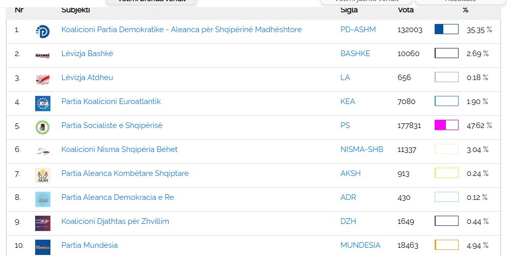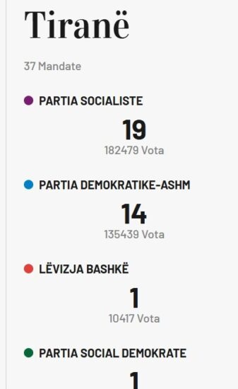 Tashmë sipas të dhënave paraprake, PS deri tani ka 19 mandate në Tiranë, PD 14, Mundësia 1, PSD 1, Nisma 1 dhe Lëvizja Bashkë 1.