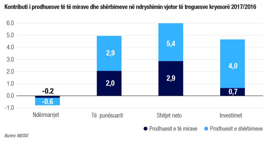Për treguesin e punësimit, prodhuesit e shërbimeve kanë kontribuar më shumë krahasimisht me prodhuesit e të mirave.