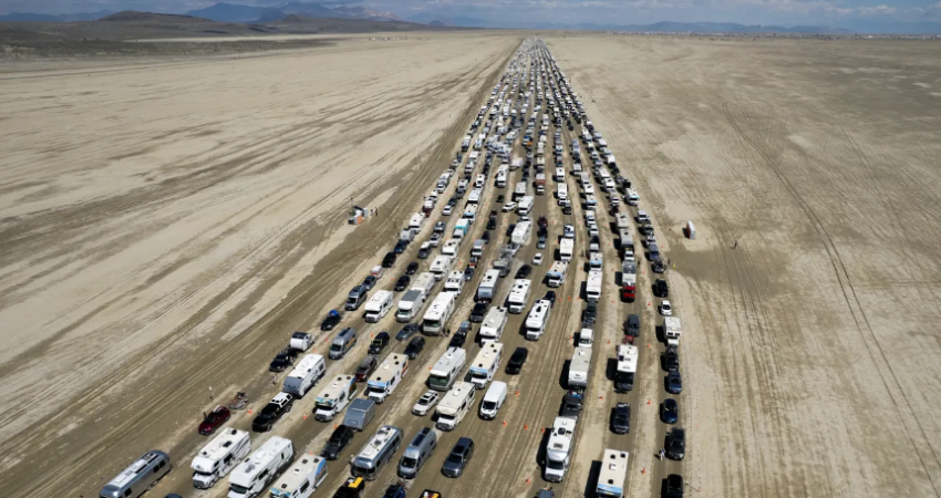 Makinat që përpiqen të largohen nga festivali Burning Man (Matt Mills McKnight/Reuters)