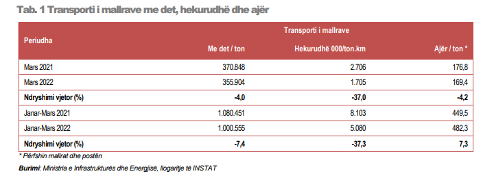 Edhe në të gjithë tremujorin e parë 2022,  sasia e mallrave të transportuara po ashtu ra, me 7.4%, nga tremujori i parë 2021.