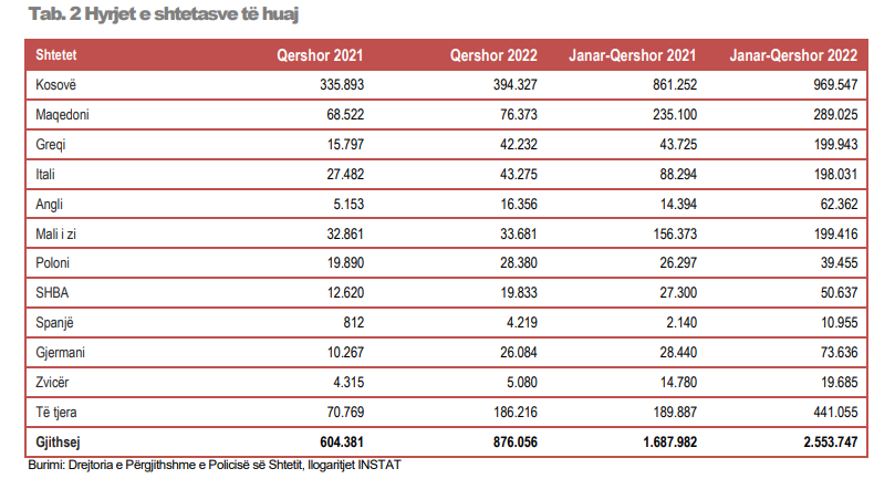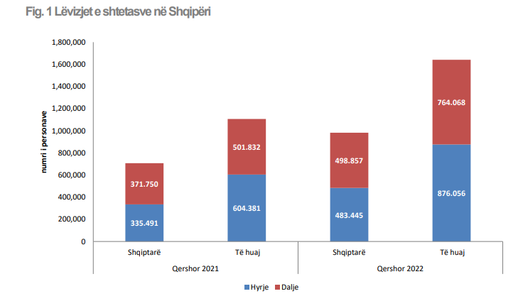 Por nga ana tjetër, rritje ka pësuar dhe numri i qytetarëve që kanë dalë jashtë territorit shqiptar. Për qershorin 2022, kanë dalë nga Shqipëria, 1.26 mln, me rritje 45% nga qershori i shkuar. Nga këto, pothuajse 500 mijë ishin shqiptarë (rritje me 34%) dhe pjesa tjetër të huaj.
