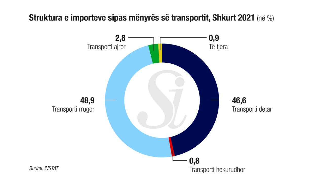 Importi dhe eksporti i mallrave për shkurtin 2021 arritën në vlerën e 77 miliardë lekëve. Nga mallrat eksportuar, 58.4% u transportuan me det, 34.1% me rrugë toksor dhe 0.4% në ajër.