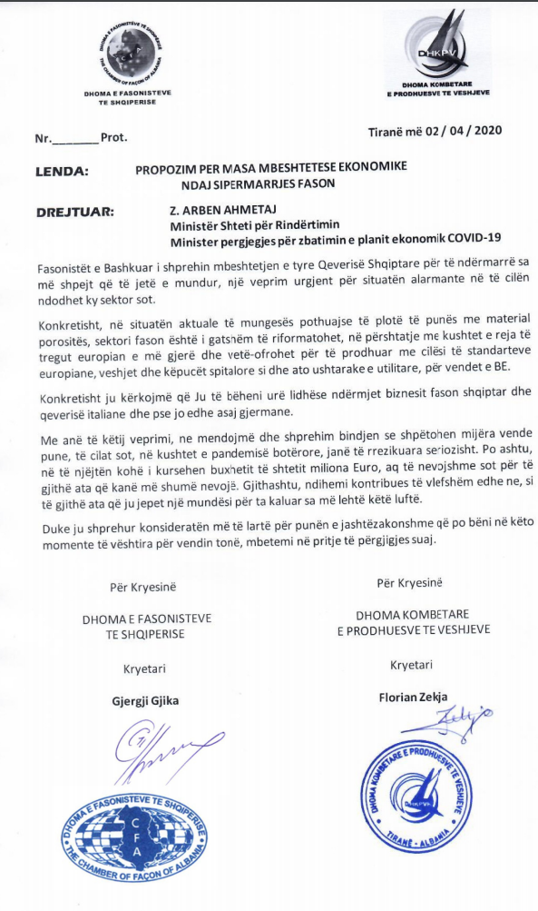 Të ndodhur në këtë situatë të vështirë, Dhoma e Fasonistëve të Shqipërisë dhe Dhoma Kombëtare e Prodhuesëve dhe Veshjeve do ti dërgonte pak ditë më parë një letër të hapur Ministrit të Shtetit për Rindërtimin Arben Ahmetaj për zbatimin e disa masave mbështetëse për sipërmarrjet Fason në situatën e emergjencës shëndetësore dhe ekonomike.