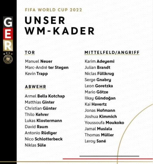 Gazeta Si – Trajneri i Gjermanisë, Hansi Flik, ka shpallur sot listën e lojtarëve të grumbulluar për Botërorin e Katarit. Ka disa mungesa të rëndësishme, ndërsa surpriza më e madhe është rikthimi i Mario Gëces, njeriut që i dha Kupën e botës Gjermanisë në 2014-ën në Brazil.
