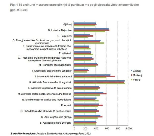 Të ardhurat nga puna sipas aktiviteteve ekonomike janë më të larta në aktivitetet financiare dhe të sigurimit me rreth 938 lekë për orë pune. Në këtë aktivitet femrat kanë të ardhura nga puna më të larta se meshkujt, të ardhurat mesatare për orë pune për femrat janë rreth 944 lekë dhe për meshkujt rreth 928 lekë.