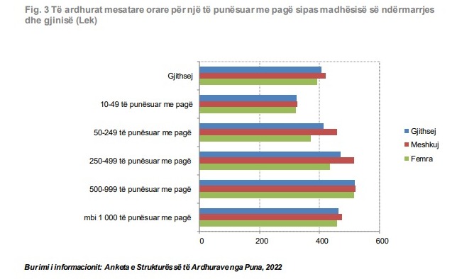 Nga gjetjet e Institutit rezulton se në çdo aktivitet, gratë janë më pak të paguara se burrat, pavarësisht formimit të tyre profesional dhe pozicionit. Krahasuar me të dhënat e 2018-s kur gratë zinin 49.4% të tregut të punës, struktura gjinore në 2022-shin ka ndryshuar dhe dominohet nga gratë, 51.8%.