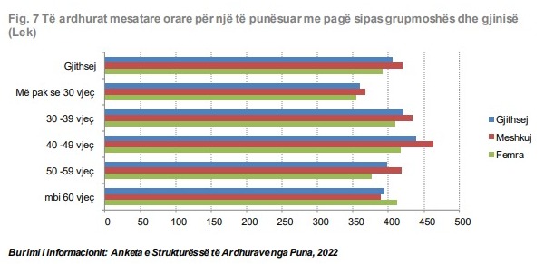 Analizuar sipas grupmoshës, një burrë në moshën 40-49 vjeç paguhet 56 lekë më shumë se një grua në të njëjtën moshë. Diferenca është 12 lekë më shumë për grupmoshën nën 30 vjeç.
