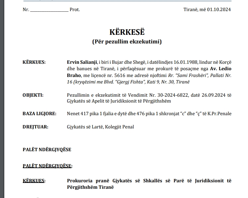 Kërkesa e Ervin Salianjit do të shqyrtohet në dhomë këshillimi. Kujtojmë që demokrati u dënua nga Gjykata e Apelit më 26 Shtator me 1 vit heqje lirie. Salianji u vetëdorëzua në Policinë e Tiranës një ditë pas dhënies së vendimit nga togat e zeza dhe u dërgua në burgun e Fierit ku do të vuajë dënimin.
