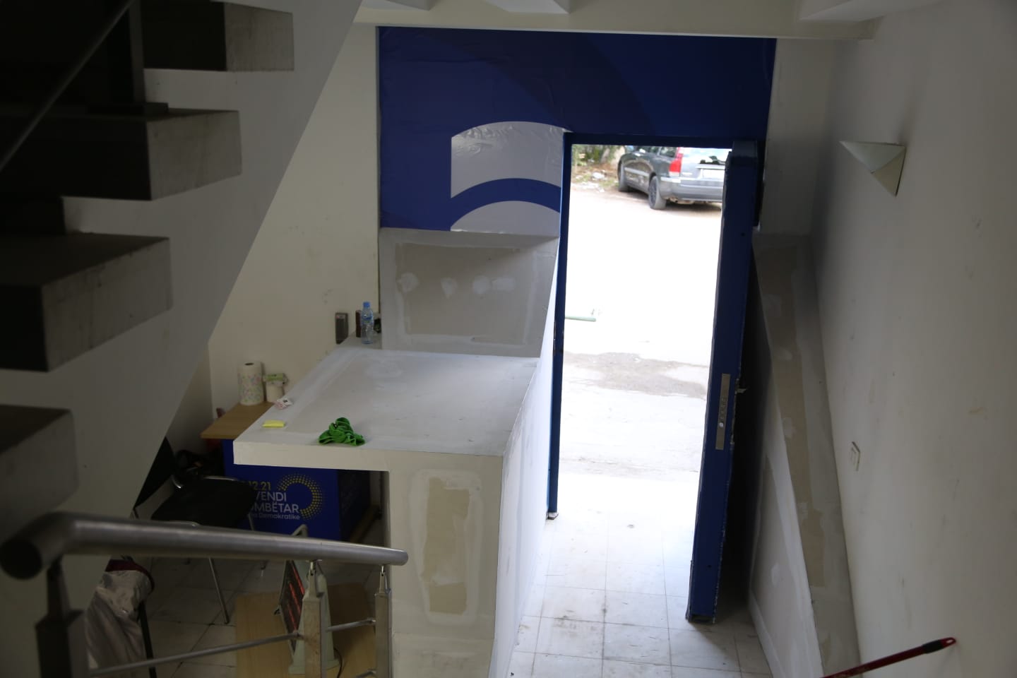Dyert e përforcuara po mbulohen me adeziv me siglat dhe logot e partisë, ndërsa mes shkallëve gjen edhe “furnizimin e ri” me fikëse zjarri.