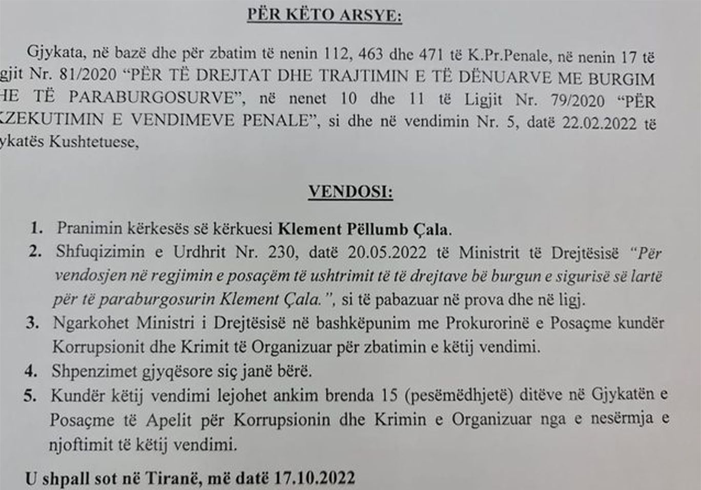 Gjykata ka pranuar kërkesën e Çalës dhe ka shfuqizuar urdhrin e 5 majit 2022 të ministrit të Drejtësisë.
