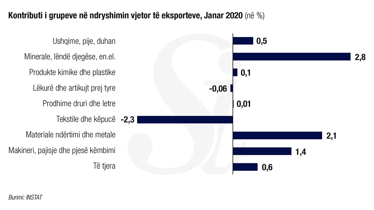 Rritja vjetore e eksporteve prej 5,2 % këtë muaj është ndikuar nga grupet: “Minerale, lëndë djegëse, energji elektrike” me +2,8 pikë përqindje, “Materiale ndërtimi dhe metale”dhe “Makineri, paisje dhe pjesë këmbimi”. Tekstilet dhe lëkurët kanë vijuar rënien.