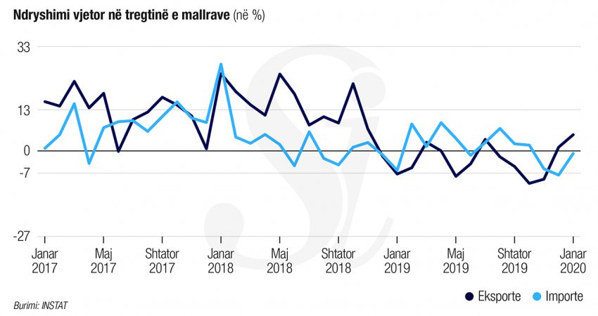 Të dhënat e INSTAT tregojnë se në Janar 2020 eksportet e mallrave arritën vlerën 23 mld lekë ose 5,2 % më shumë, në krahasim me të njëjtën periudhë të një viti më parë dhe me 4,9 %, në krahasim me Dhjetor 2019.
