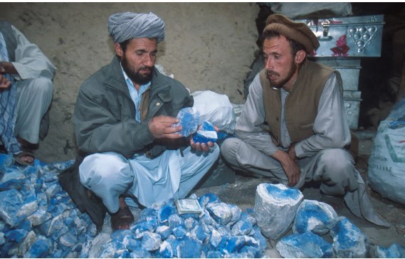 Lapis lazuli – fjalë për fjalë, “guri nga parajsa” – është pothuajse ekskluzivisht i minuar në Sar-e-Sang, një vendbanim i izoluar në veri-lindje të Afganistanit. Shkëmbi përbëhet nga tri minerale: lazurit ne ngjyrë blu të thellë; pirit ose “ari i budallait”; dhe kalcit të bardhë. Është lazuriti që minatorët kërkojnë me të vërtetë: sa më e lartë të jetë përmbajtja e lazuritit, aq më e pastër është bluja. (Ndërsa depozitat e lapisit janë gjetur në Ande dhe Siberi, këto kanë tendencë të kenë një përqendrim më të ulët të lazuritit, duke rezultuar në një blu më të zbehtë.)