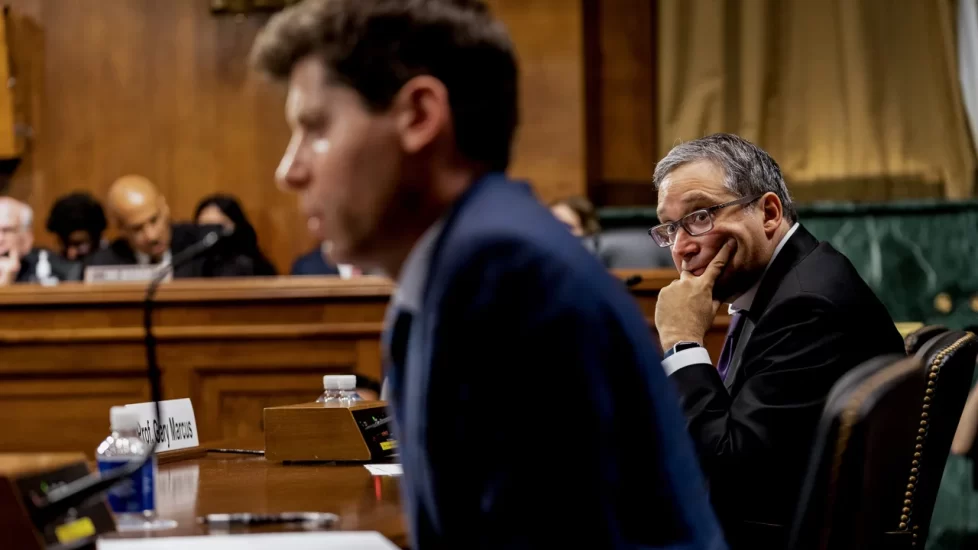 Gary Marcus, profesor emeritus në Universitetin e Nju Jorkut, djathtas, dëgjon Sam Altman, drejtor ekzekutiv dhe bashkëthemelues i OpenAI, duke folur gjatë një seance dëgjimore të Nënkomitetit Gjyqësor të Senatit në Uashington, DC, SHBA, të martën, 16 maj 2023