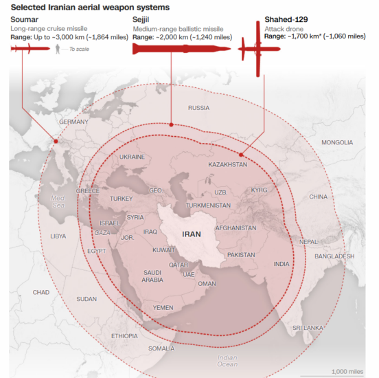 Dronët Shahed janë përdorur edhe nga Rusia në Ukrainë. Irani ka zhvilluar mbi 20 lloje raketash balistike me rreze të ndryshme, disa prej të cilave mund të arrijnë deri në Europën Jugore. Zyrtarë amerikanë paralajmërojnë se edhe pse teknologjia iraniane është më e vjetër, ajo mbetet kërcënim real.