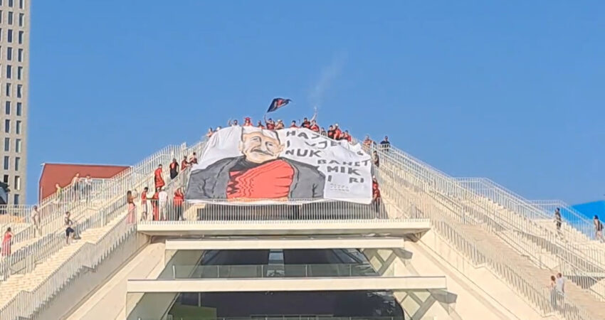 Disa orë para nisjes së ndeshjes Shqipëri-Serbi në “Arenën Kombëtare”, Tirana është “përmbytur” nga tifozët kuqezi, të cilët krahas festës me këngë e valle patriotike, kanë bërë edhe banderola ku një ndër to e kanë shpalosur te Piramida, duke thënë se “Hasmi i vjetër nuk bahet mik i ri”.