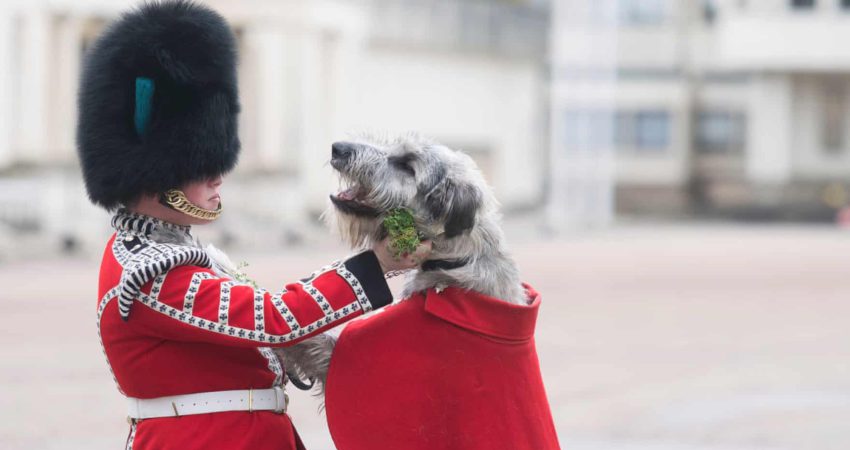 Një ujk irlandez me emrin Turlough Mor, me bateristin e tij Adam Walsh në kazermat e Uellingtonit, gjatë festimeve të Ditës së Shën Patrikut