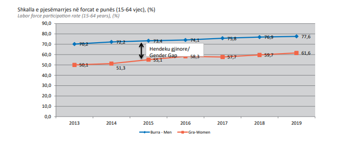 Pjesëmarrja e grave në forcat e punës është më e vogël se pjesëmarrja e burrave. Përsa i përket popullsisë 15-64 vjeç, pjesëmarrja e grave në forcat e punës, ka një përmirësim krahasuar me vitin 2018, me 61,6 % nga 59,7 % që ishte në vitin 2018.