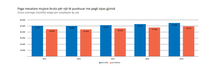Të dhënat më të fundit të INSTAT për 2019-ën në raportin “Burra dhe Gra” për tregun e punës, tregojnë se paga mesatare bruto për një të punësuar me pagë në Shqipëri, për vitin 2019 është 52.380 lekë. Kjo pagë është llogaritur me të dhënat e listë-pagesave të sigurimeve shoqërore, shëndetësore dhe tatimit mbi të ardhurat nga punësimi dhe mbulon të gjithë sektorët e ekonomisë dhe kontribuesit, shtetas shqiptarë e të huaj, për të cilët ndërmarrja deklaron pagë mujore bruto.
