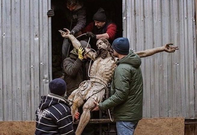 Statuja të rëndësishme historike janë hequr nga qytetarët ukrainas në qytete të ndryshme ku ka pasur sulme të vazhdueshme. Në Lviv, statuja e Jezu Krishtit nga katedralja armene e qytetit u hoq nga kisha për t’u çuar në një vend të sigurt. Këtë e tha Tim Le Berre, ekspert në ruajtjen e aseteve gjatë konflikteve të armatosura për ushtrinë franceze. Le Berre në Twitter, bashkëngjit edhe foton e bërë nga një fotograf portugez i pavarur, André Luis Alves. Po ashtu ai shpjegon gjithashtu se hera e fundit që statuja “u nxor ishte gjatë Luftës së Dytë Botërore”.