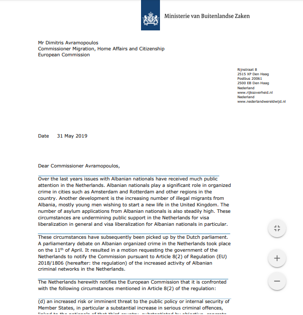 “Gjatë viteve të fundit, çështjet që kanë të bëjnë shtetasit shqiptarë kanë marrë shumë vëmendje në Holandë. Shtetasit shqiptarë luajnë një rol të rëndësishëm në krimin e organizuar në qytete të tilla si Amsterdami dhe Roterdami dhe rajone të tjera në vendin tonë. Një zhvillim tjetër është numri në rritje i emigrantëve të paligjshëm nga Shqipëria, kryesisht njerëz të rinj që dëshirojnë të fillojnë një jetë të re në Mbretërinë e Bashkuar”, e nis Holanda kërkesën e saj. “Numri i aplikimeve për azil nga shtetas shqiptarë është gjithashtu i lartë. Këto rrethana po minojnë mbështetjen e publikut në Holandë për liberalizimin e vizave për shtetasit shqiptarë”, thekson kërkesa. Ajo ka mbërritur në duart e Komisionit Europian vetëm dy ditë pas rekomandoi hapjen e negociatave me vendin tonë.