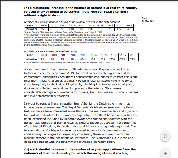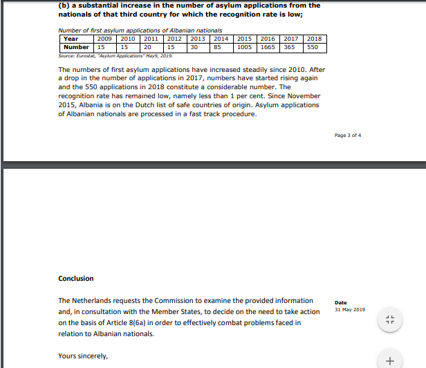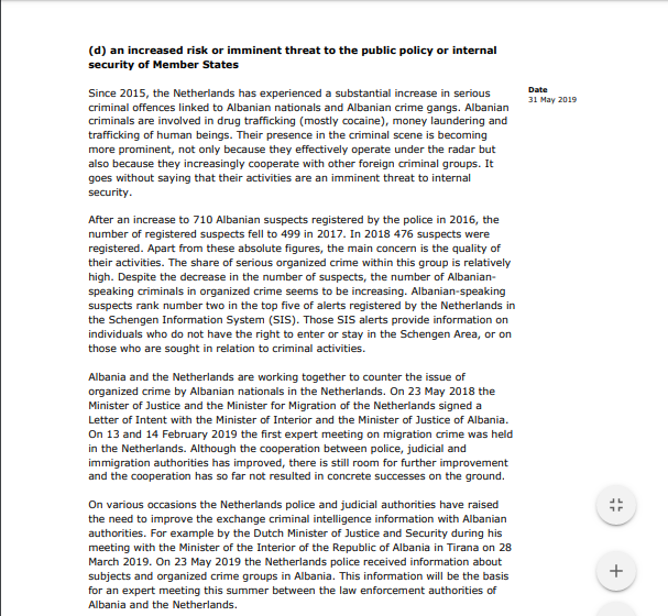 Holanda njofton Komisionin Europian se ballafaqohet me rrethanat e mëposhtme të përmendura në nenin 8 (2) të rregullores: me një rrezik në rritje ose kërcënim i menjëhershëm për qetësinë publike ose sigurinë e brendshme të Shteteve Anëtare, rritjen e veprave të rënda penale, të ndërlidhura me shtetasit e këtij vendi të tretë; me një rritje e konsiderueshme e numrit të shtetasve të këtij vendi të tretë (Shqipëria) të cilët qëndrojnë në territorin e Shtetit Anëtar (Holandës) edhe nëse i është refuzuar leje qëndrimi; me një rritje të konsiderueshme të numrit të kërkesave për azil nga shtetasit e këtij vendi të tretë dhe një rrezik në rritje ose kërcënim i menjëhershëm për politikën publike dhe siguria e shteteve anëtare”, shkruhet në kërkesë.