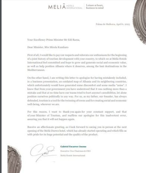 Në letrën drejtuar kryeministrit Edi Rama dhe ministres së Turizmit, Mirela Kumbaro, Gabriel Escarrer Jaume thotë se ekipet kanë përdorur një hartë të vjetër, ndërsa shpreh mirënjohjen që qeveria shqiptare e ka kuptuar që është vetëm një gabim.