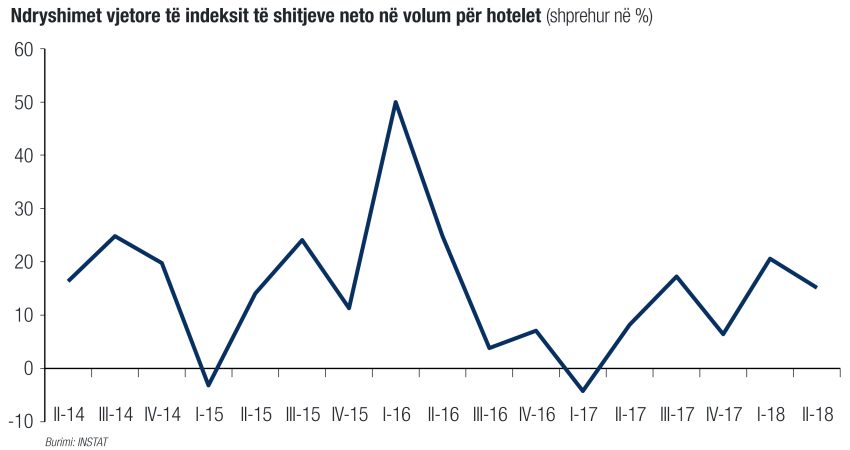 Sipas të dhënave të INSTAT, në tremujorin e dytë të 2018-ës hotelet kanë bërë 15,1 % më shumë shitje krahasuar me të njëjtën periudhë të një viti më parë.