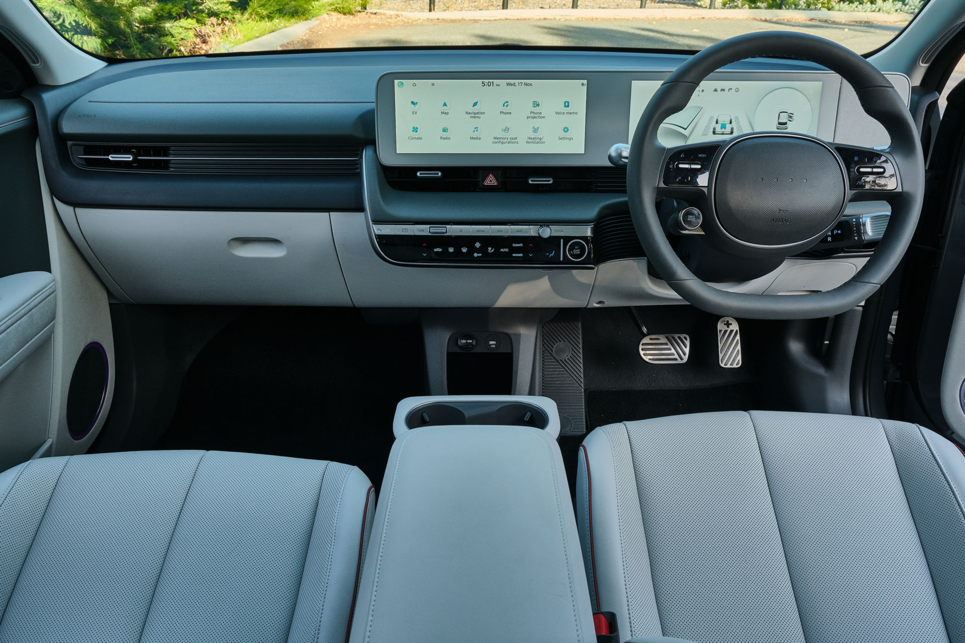 Brendësia është po aq intriguese sa pjesa e jashtme. Ndryshe nga modelet hibride, plug-in hibride dhe EVs Ioniq, kabina e Ioniq 5 është ndryshe nga cdo gjë tjetër në gamën e Hyundai.