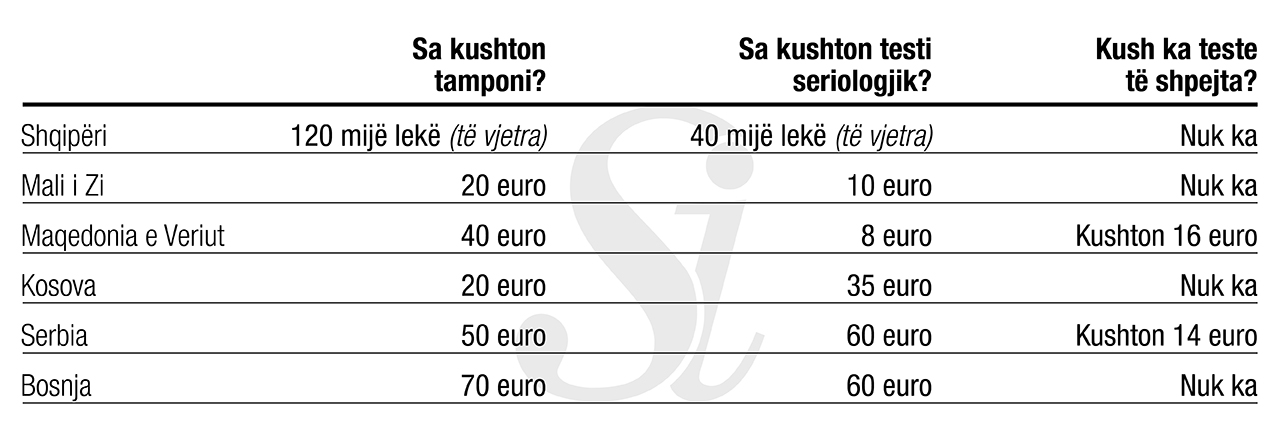 Vendi ynë mban rekord çmimesh të larta jo vetëm në krahasim me vendet fqinje por edhe ato europiane. Në Francë tamponët po i bëjnë kryesisht falas, ndërkohë që në Italinë fqinje diku 20 euro. Ndër çmimet më të ulëta në Europë i ka Turqia, me një çmim prej 15 eurosh.