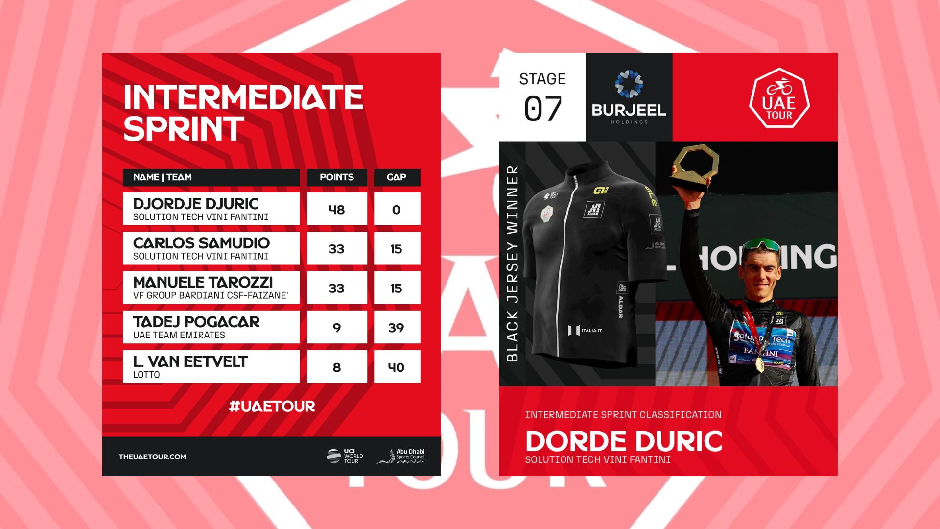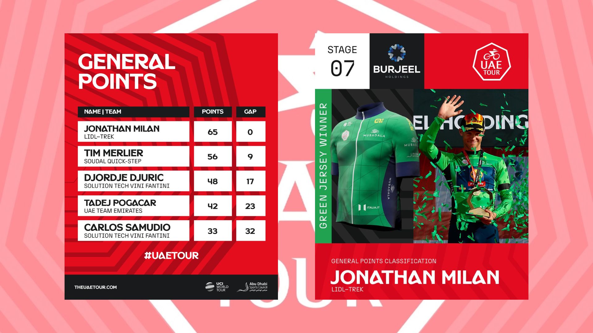 Vetëm Giulio Ciccone dhe Oscar Onley e mbajtën ritmin por vetëm për 200 metra. Çklisti i Lidl-Trek e kaloi finishin 32” pas Bluzës së Kuqe, 3” përpara Pello Bilbao-s që u ngjit në podiumin e 3 në “UAE Tour”. Në klasifikimet e tjera Jonathan Milan konfirmoi Bluzën e Gjelbër, Djordje Djuric rifitoi Bluzën e Zezë dhe Ivan Romeo fitoi Bluzën e Bardhë. Të tjerë emra të mëdhenj që morën pjesë në të parin tur çiklistik për vitin 2025 ishin Primoz Roglic, Adam Yates dhe Remco Evenepoel. Emra të cilët do ti shohim edhe në rrugët tona në Durrës, Tiranë dhe Vlorë si pjesë e “Giro d’Italia 2025”