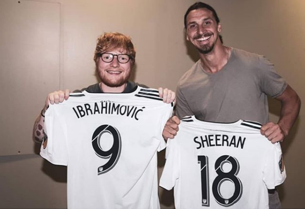 Mes 90 mijë personave të pranishëm në koncertin e Ed Shiran, në stadiumin “Rose Boël”, ishte edhe sulmuesi i Los Anxheles Galaksi, i cili përfitoi nga dita e pushimit. Ibrahimoviç ndoqi nga afër spektaklin e artistit anglez dhe në fund është takuar me këngëtarin. Suedezi i dhuroi fanellën e tij, si dhe një fanellë të personalizuar Ed Shiranit. Të dy më pas kanë postuar foto në profilin e tyre në Instagram: “Kur gjeniu Ed Shiran më në fund ka takuar Zotin. Faleminderit për koncertin e paharrueshëm në “Rose Boël”, – shkruante Ibrahimoviç në postimin e tij, duke e quajtur sërish veten “Zot”. Dhurata e lojtari është vlerësuar nga Ed Shiran, i cili e ka veshur menjëherë fanellën përballë fansave të tij në Los Anxheles.
