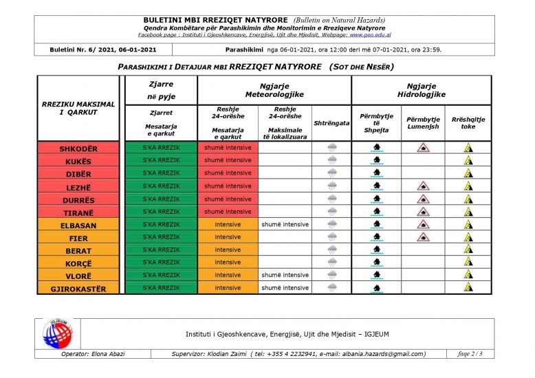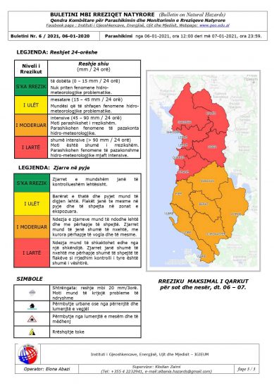 “Sipas llogaritjeve të IGJEUM, përgjatë datave (6 -11 Janar 2021) priten reshje shumë intensive, pothuajse në të gjithë territorin. Nga llogaritjet hidrologjike të IGJEUM,  këto reshje do të sjellin rritje të rrezikshme të prurjeve në lumenjtë e mëdhenj dhe të mesëm Drin-Buna, Mat, Ishëm, Erzen, Shkumbin, Seman dhe Vjosë. Përmbytje mund të shkaktohen nga lumi Drin-Buna dhe Liqeni i Shkodrës me prurjet maksimale të cilat parashikohen të arrijnë zonat e rrezikuara në datën 12 Janar 2021. Lumenjtë Mat, Ishëm, Erzen dhe Shkumbin do i arrijnë prurjet maksimale në fundin e datës 8 dhe 9 Janar 2021. Lumenjtë Seman dhe Vjosa parashikohen të rrezikshëm, por me probleme më të vogla lokale të përmbytjeve”, thuhet në njoftimin e IGJEUM.