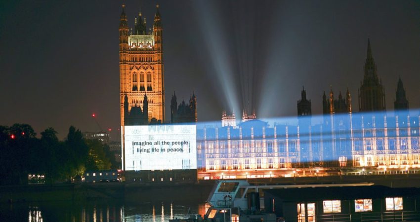 Ca copëza te tekstit nga kënga e legjendarit John Lennon “Imagine” janë shfaqur me prozhektor në murin e Parlamentit në Londër për të përkujtuar 50-vjetorin e publikimit të albumit.