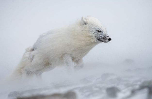 Një dhelpër e bardhë që e merr era, një murmuritje zogjsh përballë një stuhie bore në Himalaje dhe një burrë me një djalë në një dhomë të përmbytur janë ndër imazhet që fituan çmim në konkursin e Fondacionit për Fotografi Mjedisore të këtij viti.