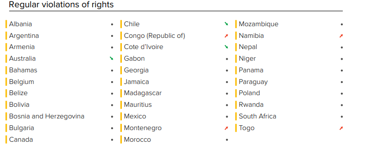 Indeksi Global i të Drejtave të Punonjësve 2023 përshkruan vendet më të këqija në botë për punonjësit, duke vlerësuar vendet në një shkallë nga 1 në 5+ për shkallën e respektimit të së drejtave të tyre.