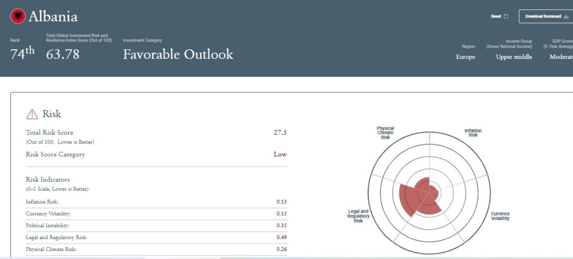 Nga Gazeta ‘SI’ – Shqipëria zë vendin e 74-të në renditjen botërore të Indeksit të Riskut të Investimeve dhe Elasticitetit, nga 226 shtete në listë.