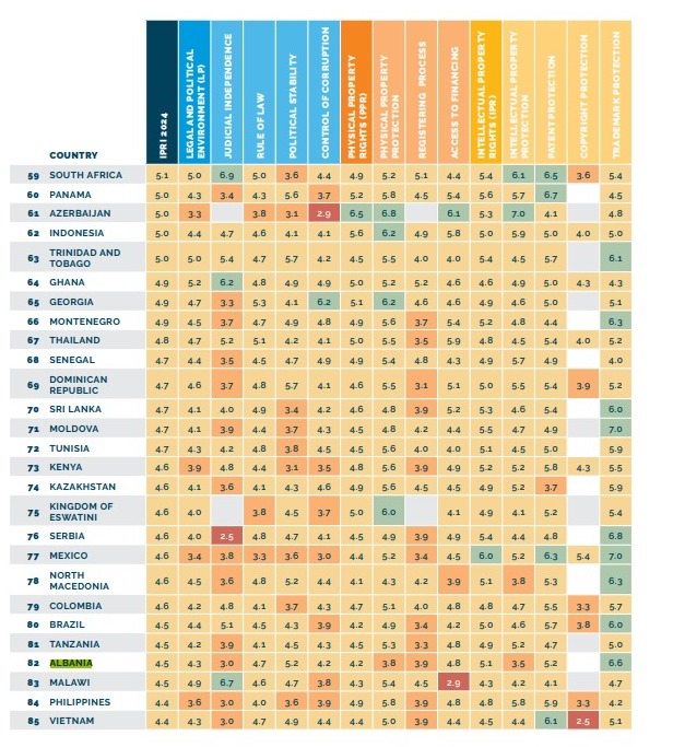 Sipas Indeksit për të drejtën e pronës të vitit 2024, Shqipëria renditet në vendin 82 nga 125 shtete në listë me 4.5 pikë në total dhe me një rënie 0.2% nga indeksi i 2023-shit.