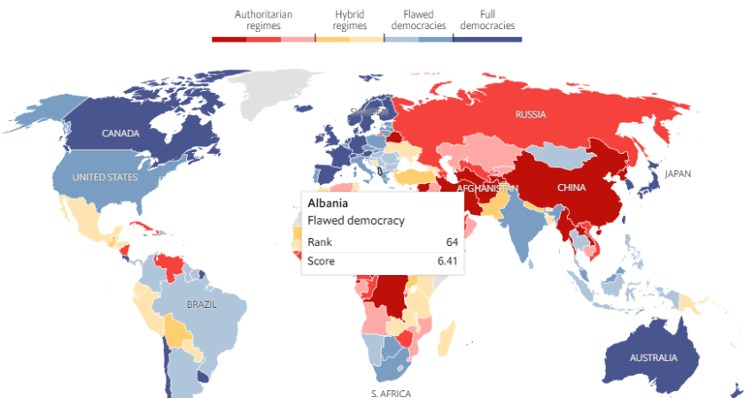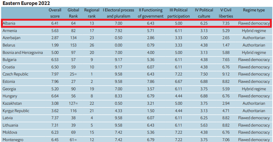 Sipas tabelës së The Economist ky është vlerësimi më i lartë ndonjëherë i Shqipërisë në këtë index që nga 2006-a.