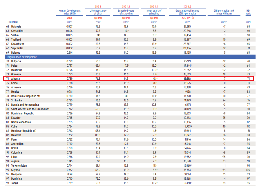 Nga Gazeta ‘SI’ – Shqipëria ka bërë hapa pas në Indeksin e Zhvillimit Human, HDI, për vitin 2023 duke humbur 7 vende në renditje dhe 0.07 pikë.