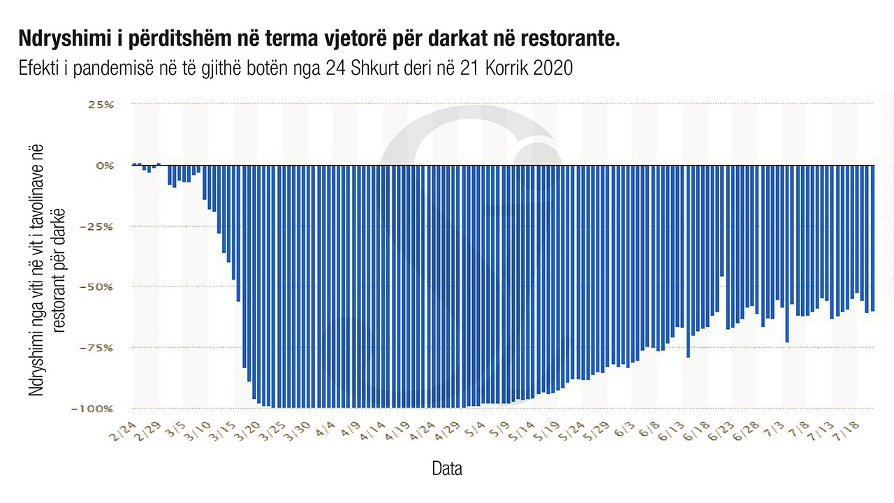 Sipas Open Table, që ka në platformën e saj mbi 60 mijë restorante, rënia vjetore e konsumatorëve për darka në restorante në të gjithë botën ishte mahnitëse, 59.86 përqind në 21 korrik 2020.
