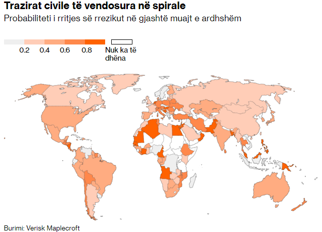 Nga 198 vende të gjurmuara në Indeksin e Trazirave Civile, 101 treguan rrezik në rritje në tremujorin e tretë të 2022, sipas hulumtimit të mbledhur nga firma e inteligjencës Verisk Maplecroft . Kjo është rritja më e madhe që nga zhvillimi i renditjes në vitin 2016, tregoi ai.