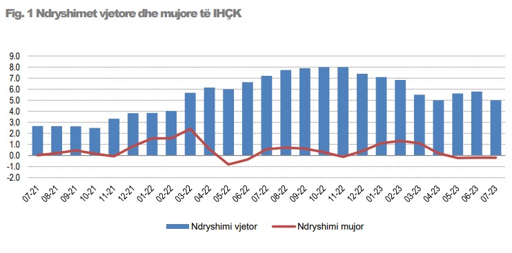 Sipas INSTAT ndryshimi vjetor i matur nga indeksi i Harmonizuar i Çmimeve të Konsumit në muajin Korrik 2023 është 5% nga 4.2% sipas metodologjisë vendase.